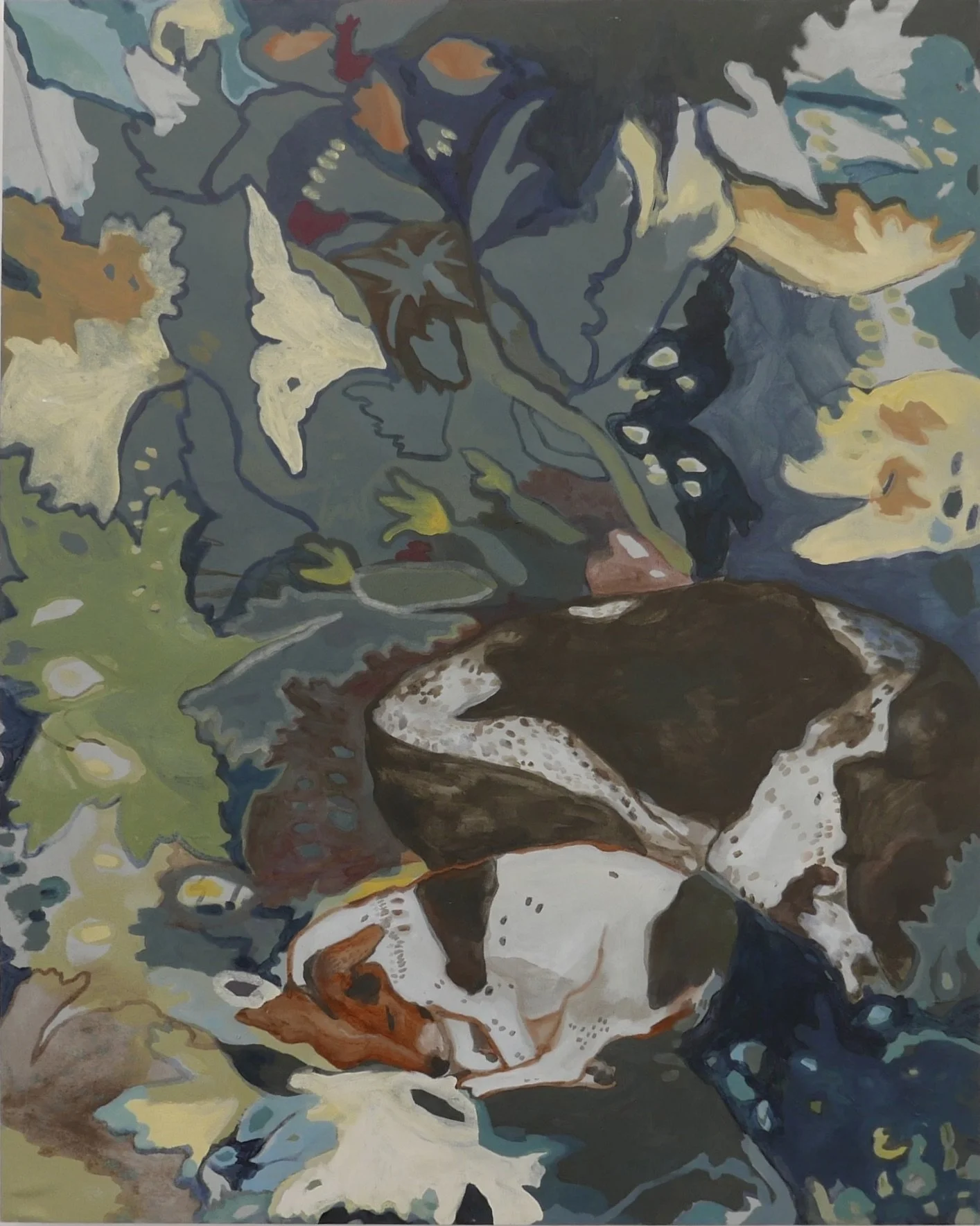 Entangled in curiosity and stitched together with care, my practice is rooted in the everyday. It celebrates the whimsy and magic in the in between and the overlooked. I have just completed my final year at the Glasgow School of Art studying Painting and printmaking. I consider myself a landscape painter and my paintings as postcards, mementos of fleeting moments and documentation of the turbulence of everyday life. I am drawn to the acts of crafting, preserving, collecting and reusing, prolonging the lives of objects or moments and sharing them with others. My love of cooking fuels my art practice. For me, painting and cooking are intertwined as food, like art, acts as a vessel for stories. Inspired by my family’s vegetable garden in Herefordshire, I have borrowed compositions from community gardens and allotments in Glasgow, as a way to stay connected to the land and the seasons while living in the city. I am inspired by plants and their application to ornament, noticing the lyrical rhythms in their tangled leaves.